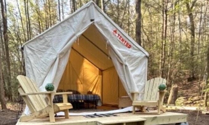 Your Tentrr campsite includes a 10'x12' (120 square feet) safari-style canvas tent on a raised wooden platform. Inside the tent you'll find one queen bed with a memory foam mattress. The tent is big enough for the bed plus one or two extra sleeping bags on the floor. Aside from the canvas tent, campers can also use the extra 5-person pop-up dome tent that’s provided. You'll also have a 6-ft picnic table, outdoor fire pit, and 2 Tentrr Adirondack chairs.