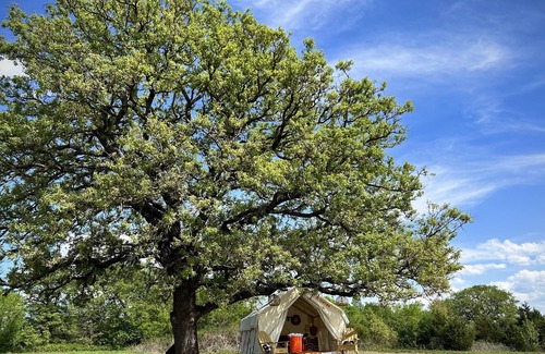 Peace, tranquility, and a luxurious glamping experience await you at the 3 Oaks. Nestled on top of a hill overlooking a large fully stocked fishing pond in the rolling plains of the great Oklahoma wilderness. Spend the day at Sparks Vineyard & Winery only a 20 minute drive away!