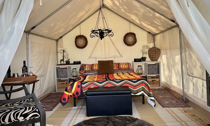Your Tentrr campsite includes a 10'x12' (120 square feet) safari-style canvas tent on a raised wooden platform. Inside the tent you'll find one queen bed with a memory foam mattress. The tent is big enough for the bed plus one or two extra sleeping bags on the floor. Aside from the canvas tent, campers can also use the extra 5-person pop-up dome tent that’s provided. You'll also have a 6-ft picnic table, outdoor fire pit, 2 Tentrr Adirondack chairs, and a heating source to keep you warm and toasty at night.