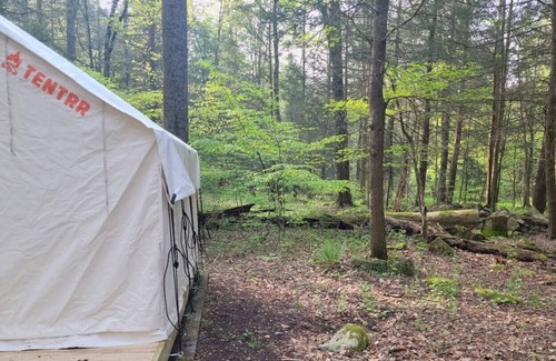 Each Tentrr campsite is furnished with a pre-set canvas wall tent on a wooden deck. There is a queen bed frame and memory foam mattress and two side tables inside the tent. Campers also have two Adirondack chairs, a picnic table, a dry storage box and fire pit at their campsite.