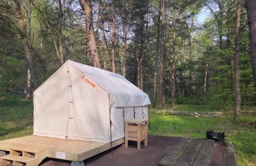 Each Tentrr campsite is furnished with a pre-set canvas wall tent on a wooden deck. There is a queen bed frame and memory foam mattress and two side tables inside the tent. Campers also have two Adirondack chairs, a picnic table, a dry storage box and fire pit at their campsite.