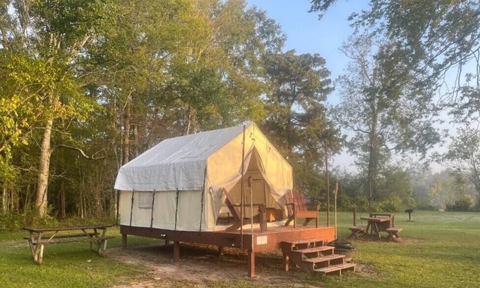 Site A is a single campsite with one canvas platform tent. Kick back and relax in the two Adirondack chairs on your tent deck This tent is furnished with a queen-size bed and memory foam mattress plus two end tables. An included pop-up tent can house additional campers (up to 4) but you will have to bring air mattresses or sleeping pads for the pop-up tent. Your group can enjoy the included fire pit, grill, picnic table, and benches during your stay. The site is approximately .5 miles from the main entrance of the park, driven all on paved and gravel road. This site cannot accommodate an RV due to its location and the size of the parking spaces. From your parking spot, the tent is right next door allowing easy and quick access to the car! From your tent, you can see the other site as it shares the same parking spot. At the campsite, you can enjoy full sun, with little to no cell phone coverage. This site provides an excellent way to unplug, unwind and soak up some sun! Swimming in the water at the park is not allowed due to the alligators. Other dangerous animals to watch out for would be (but not limited to) wild hogs, racoons, bears, and snakes.