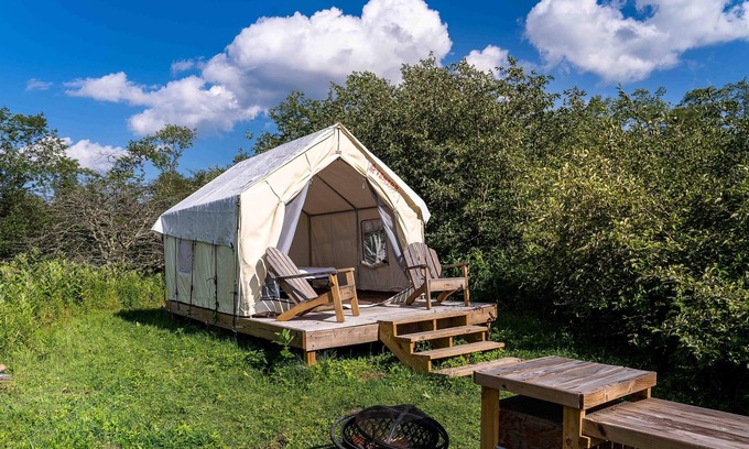 Campsite A is a hike-in site and it is approximately a 15 minute walk from the parking location to the tent. It is equipped with a pre-set sturdy canvas tent on it's own wooden deck platform. The tent is furnished with a queen-size memory foam mattress and side tables. A picnic table, fire pit with a grill, a solar shower, and portable camp loo are also provided, and campers are able to use the park's restroom facilities as well. There is an additional pop up tent provided for extra guests, but you will have to bring your own air mattresses/sleeping pads for this tent.