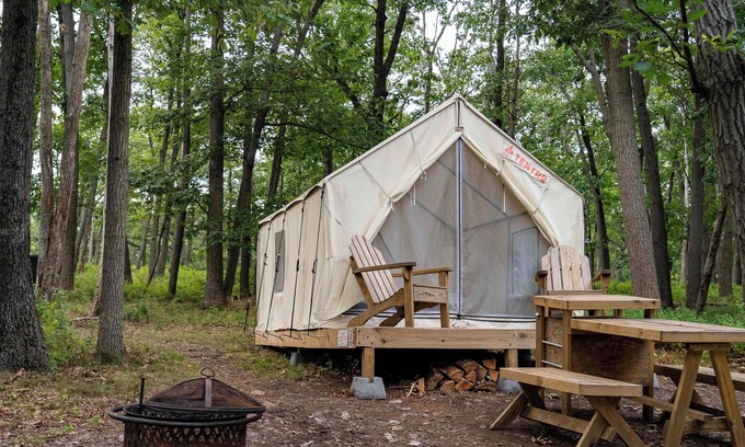 This campsite is equipped with a pre-set sturdy canvas tent on its own wooden deck platform. The tent is furnished with a queen-size memory foam mattress and side tables. A picnic table, fire pit with a grill, a solar shower, and portable camp loo are also provided, and campers are able to use the park's restroom facilities as well. There is an additional pop-up tent provided for extra guests, but you will have to bring your own air mattresses/sleeping pads for this tent.