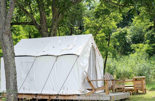Your campsite is equipped with a sturdy canvas tent on its own wooden deck platform. The tent is furnished with a queen bed and memory foam mattress and side tables. A picnic table, fire pit with a grill, solar shower, and portable camp loo are also provided. There is an additional pop-up tent provided for up to 4 extra guests, but you will have to bring your own air mattresses/sleeping pads for this tent.