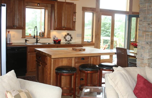 Guesthouses in JH are limited to 1000sf, and we have made good use of every bit of ours! The stairs and oversized deck to the cabin lie on the north side, or pond side of the cabin, facing the incredible Grand Tetons. Enter into the great room with kitchen, dining and living areas, hickory wood floors and knotty alder ceilings. The kitchen window also faces north towards the Tetons so washing dishes will never be a chore!