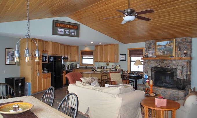 Just a 10-minute drive to Driggs, this stunning angler's paradise is a riverfront property with breathtaking river and Teton mountain views. A rustic riverside cabin nestled along the Teton River in beautiful Teton Valley, offering direct fishing access right from your back door. This wonderful home accommodates 6 individuals across 3 bedrooms and 3 bathrooms. A large deck to soak in the sunrise/sunset and enjoy the wildlife that is abundant. Warm and inviting this open concept kitchen and living room will make you feel at home. In close proximity, Teton Valley Lodge is available for fishing licenses, boat rentals, and guided excursions.