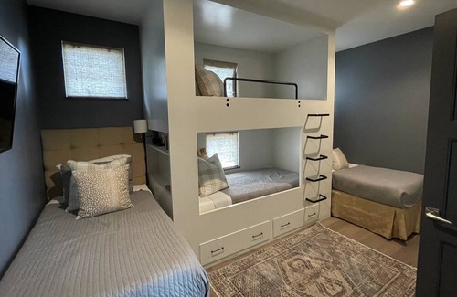 The two bedrooms with king beds provide a luxurious sleeping arrangement, while the queen bedroom offers a comfortable option for couples or individuals. The bunk room with four twin beds is perfect for children or groups of friends. Overall, this layout offers plenty of options for accommodating different groups of people and their sleeping arrangements. Each room has an ensuite bathroom for added convenience.
