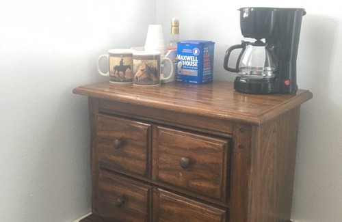 We invite you to take it easy at this simple and tranquil getaway. The cabin is a walk-in guest room with bathroom, and is located on the same property as the main house and other guest houses. You will be given privacy. We furnish a mini-fridge, toaster, coffee maker and coffee supplies. Our walk-in cabin offers free wi-fi and a Roku Smart Tv. This is a great place for you to spend the night and to springboard into your hill country adventures, enjoying the Cowboy Capital of the world.