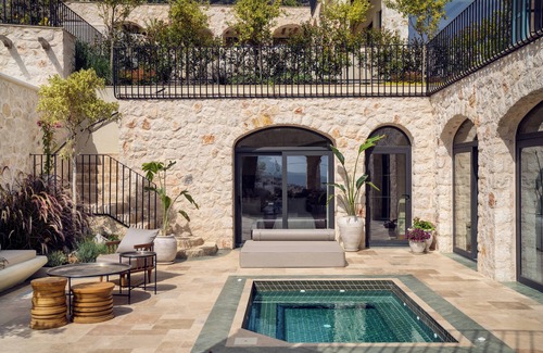 As you approach the house, you are greeted by a grand pool with elegant arches and columns standing proudly on its long stairs, a hallmark of Mediterranean and Lycian design that sets a tone of timeless beauty and relaxation. The courtyard, the heart of the property, features a large hot tub pool at its center, inviting guests to unwind under the open sky. All bedrooms have openings to this tranquil courtyard, ensuring a seamless connection between indoor comfort and outdoor serenity.