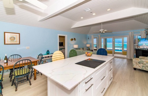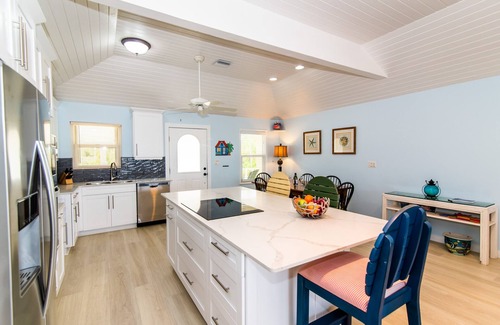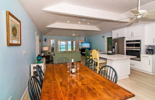 There is a brand new modern bedroom on the west side of the house with a queen bed and ensuite bathroom. The family/children's suite, on the east side of the house, has incredible ocean views, a comfortable queen bed and a set of bunk beds, perfect for small children. There is also a large TV, and ensuite bath with dual vanities, and walk-in shower; plus walk-out access to the screened porch.