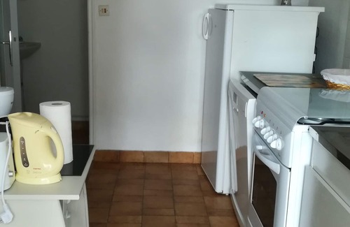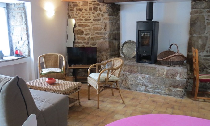 The living room features a television, a sofa, two seats, a firewood stove (wood provided), and a table. A kitchen area is equipped with a gas cooker, an oven, a microwave, a washing machine, a toaster, a refrigerator, and kitchenware. There is a large bedroom with a closet, a 140-cm bed and a small desk, as well as a second bedroom with two 80-cm beds and a closet. You will also find a bathroom with bathtub and a washbasin. There are two toilets. It features a courtyard and garden with garden furniture and a barbecue. Parking is available.