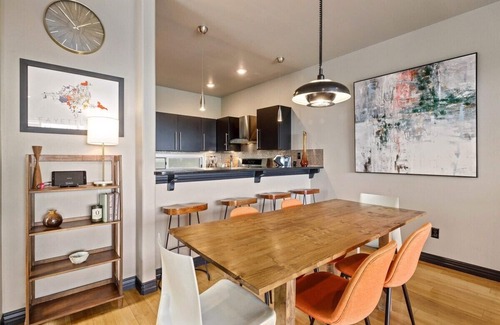 Our townhome is recently designed and decorated to be a sleek & modern showstopper with the utmost comfort. Wander through our 3-story townhome & enjoy beautiful details & color with mid-century modern accents and plenty of live greenery.