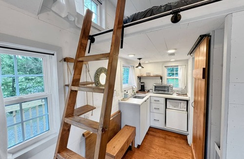 Tiny Home Charm: A cozy loft bedroom with ladder access and a modern bathroom with a refreshing shower.