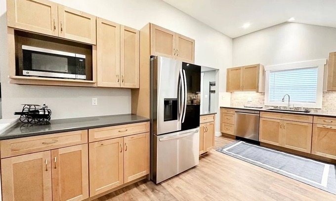 - Kitchen supplies: pots & pans, dinnerware, bakeware, plasticware for children, toaster, blender, dual coffee maker (drip), glassware, food storage containers, wine glasses, and more!