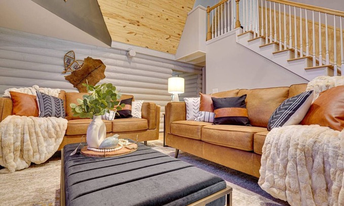 Welcome to The Alpine - our luxury cabin in the city where rustic charm meets modern elegance. Enjoy our newly renovated cozy cabin in the heart of Duluth. Relax in the grand living room with a 75" TV and electric fireplace. Unwind in the game room with 90s video games. Indulge in the hot tub or gather around the fire pit. Cook up a storm in the fully stocked kitchen. Share meals in the Alps-style dining room or swing in the porch chairs for great conversations. Rest peacefully on a memory foam mattress with luxe linens and blackout curtains.