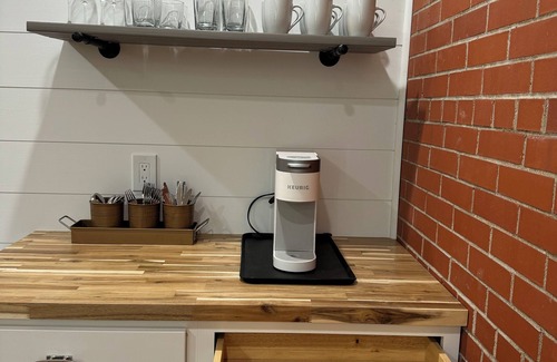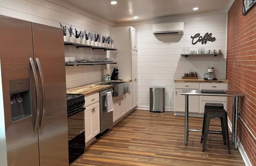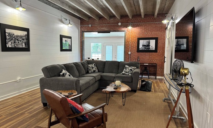 This unique brick industrial apartment sleeps four. Has a kitchen, bath with washer and dryer, living room and two bedrooms.