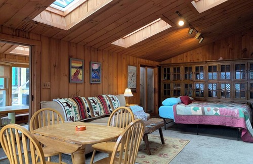 APT. 2- Upon entering this large Apartment, you will fall in love with the vaulted ceilings, the skylights, and the private deck with lake vistas. This carpeted, sun drenched Master Bedroom is furnished with a comfy large couch, table and chairs, HD TV, a king size bed and lake views. Additionally, there is an efficiency kitchen that includes; a sink, a microwave, and small fridge, as well as a coffeemaker. A full size bathroom with tub and shower, coupled with an additional two rooms, for use as a den AND an office complete this delightful retreat!