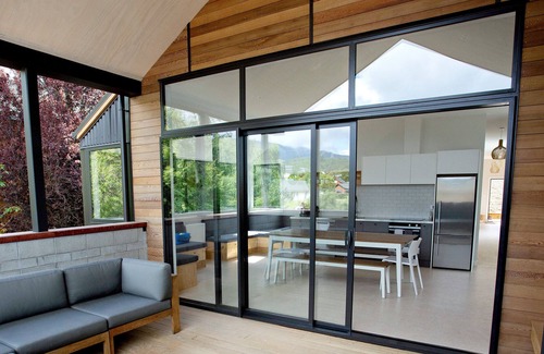 Designed with striking timber, glass and concrete, The Architect's Lodge is a brand-spanking-new holiday home with stunning alpine views, accommodating up to 7 adults and 3 children.