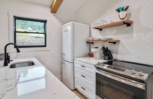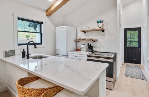 The modern, yet unique design of this tiny house allows it to not feel “tiny” and the full kitchen takes advantage of this layout. High end appliances, countertops and cabinets line the kitchen while the elevated dining bar allows you to enjoy any meal!