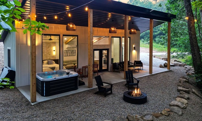Welcome to your brand new 1-bedroom, 1-bathroom modern cabin, nestled amidst the enchanting woods of Hocking Hills. This secluded retreat is thoughtfully designed to provide the ultimate haven for couples seeking tranquility and an escape from the bustling city life. The exterior features a combination of sleek lines, warm wood accents, and expansive windows that offer breathtaking views of the lush forest canopy.
