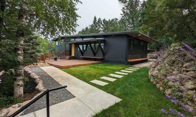 The Atomic Lodge is nestled atop a hill, surrounded by towering pines and boulder walls. This stunning mid century marvel was built in 1960 and has been meticulously renovated to its former glory and beyond. This home boasts flawless landscaping from a spacious front deck and a backyard patio, to a fire pit and a sauna - this place has it all. Sleeping up to 12 guests, the inside has a luxury modern kitchen, a wood burning fireplace, formal dining, movie and game rooms, finished beautifully.