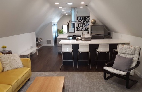 This is an awesome attic apartment sanctuary in the private guest quarters of a large modern farmhouse. Your own private entrance enters to a large comfortable attic Suite with a separate bedroom with King bed. Lots of storage throughout the unit. Includes a full Galley Gourmet Kitchen with gas range, dishwasher, quartz counters, and a large farmhouse sink and enough space for four at the eat up bar!
