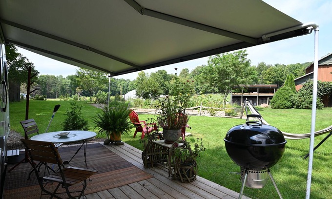 it has a super cool awning that has lights around it. A 8x16 deck with a bistro table and grill. you also have your own campfire pit to enjoy!