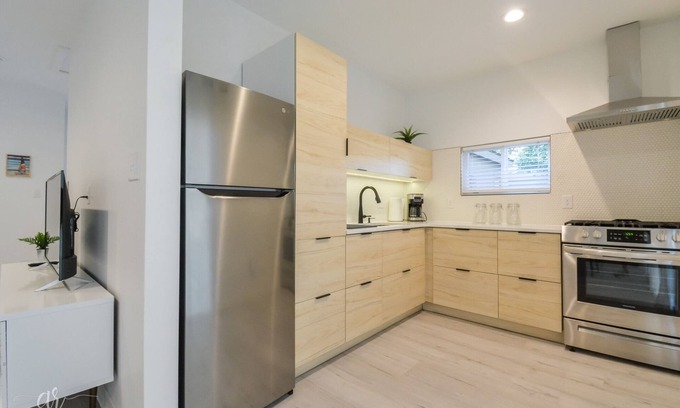 The guesthouse studio offers one full bathroom with modern fixtures, as well as a fully equipped kitchen with a refrigerator, gas cooktop, and oven--all you would need to cook a delicious homecooked meal. The open-concept layout creates a bright and airy ambiance, perfect for relaxation and enjoyment.