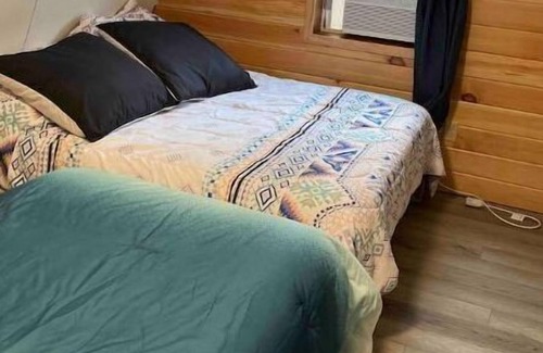 This barn shaped cabin has comfortable beds and furniture. Downstairs is light knotty pine and the upstairs is air conditioned which keeps the whole place cool. Upstairs is a loft divided into two sections by a 1/2 wall.