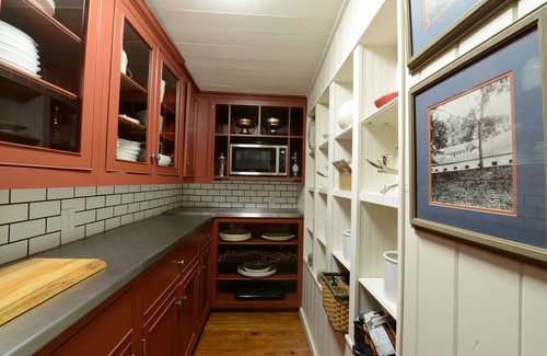 After numerous owners and renovations, the latest transformations reveal a more open and sociable floor plan infused with classic yet updated features.The unveiling begins with a custom barn door entry and striking antler handles that suggest what is to follow. Once inside, guests are greeted by a grand stone-floored foyer and dining room that leads into the great room. Scotty Mitchell designed the house with warmth and comfort giving it a relaxed elegance. Tasteful features include the reclaimed heart pine floors, touches of leather and iron, and soft wool carpets that run throughout the house. Each room contains a subtle reminder of the barn’s past whether a pair of leather riding boots, a hunting trophy, an antique horse feeder, a bit, a bridle or a riding habit. The once separated living areas are now reshaped into one large yet intimate space in a soft palette that showcases the gallery of original art, bronzes, antiques, and custom furniture. There is a large stone fireplace and multiple seating areas that can accommodate large gatherings while still feeling cozy for smaller groups. The dormer windows in the great room create more openness while offering a visual surprise at dusk. The expansive commercial kitchen gleams with European pottery, copper, and stainless. It is fully appointed for guests to prepare their own gourmet meals or to bring in a private chef or Caterer. Guests can also enjoy a casual meal at the custom-built bar table in the kitchen. The media room, adjacent to the front foyer, has the most comfy sectional to snuggle into and watch movies or the big game on the large screen.