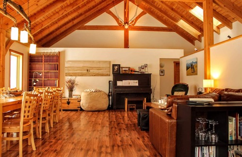The guesthouse, which we lovingly call "The Barn", is part of the M&M Ranch in the foothills, with horses and horse riding being the main attraction. There is a beautiful, large common area, full kitchen, and dining area (table seats up to 16) and 5 bedrooms, offering a total of 8 beds. We can only take a maximum of 8 people including children due to our septic system and well. During the winter season (Nov-April) we only offer bookings of the entire lodge on a self-catering basis. The lodge is located on the second story, so it is not accessible by wheelchair. Our space is also great for small events, reunions, seminars, and corporate functions!