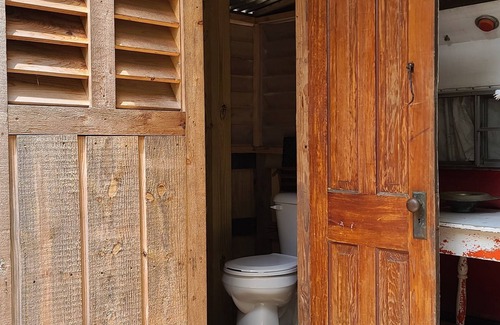 This one-of-a-kind ZEN Garden, glamping spot, The Bath House will not disapoint you. If it's the outdoors you love, then, this vintage 1964 camper situated under a covered patio and huge beautiful mature trees and surrounded by a very unique artistic one-of-a-kind fence. With a beautiful out-door kitchen, ice maker, frig/freezer and plenty of seating for entertaining or relaxing. You'll enjoy a huge 6ft soaking tub and a rain head shower as you relax in the evening while gazing at your fire on the deck.