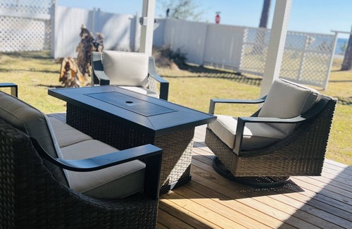 This beautifully decorated home sits directly across from St. George Sound, offering breathtaking views of both sunrises and sunsets. The covered porch is furnished with plenty of seating and a fire pit, perfect for relaxing evenings.