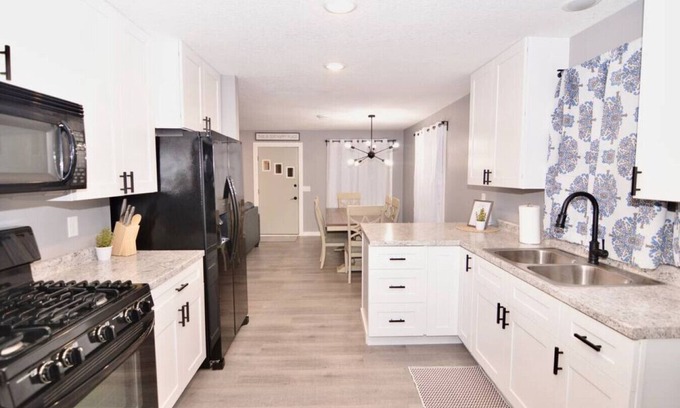 Guest house: This space was given extra love to make it unique. Kitchen with utensils, dinnerware, pots/pans and other kitchen basics included. Refrigerator/freezer, living room with seating and TV w/Roku. Two bedrooms with a queen bed in each. Bathroom with a tub/shower.