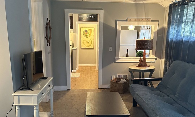Kick back and relax in this calm, stylish, cozy cottage with so much to offer year-round! with a comfortable 1 bedroom queen size bed, furniture, designated work space, living room with a futon for 2, full equipped kitchen, front porch and an outside eating area