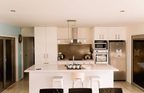 There are pantry basics of tea, salt, sugar and flour. The kitchen is well stocked with pots, pans, toaster, kettle, sandwich toaster, platters, boards, coffee plunger, Nespresso capsule machine, blender, crockery, cutlery, water and wine glasses, plus plenty of tea towels and dish cloths. The 10 seater dining table is perfect for family meals, board games and jigsaw puzzles, (both of which there are plenty to choose from).