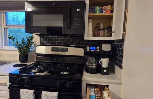 No matter why you're visiting, this apartment is perfect for you! With a dedicated work area and high-speed internet, it is perfect for remote work or a quiet study space. Our modern security system ensures our guests' safety and provides peace of mind. The kitchen is fully stocked with starter cooking supplies.