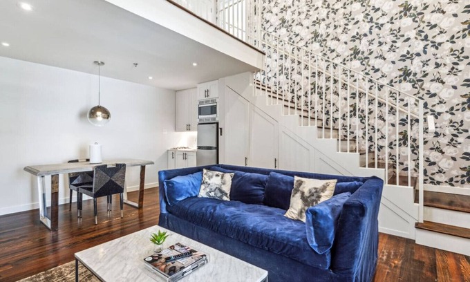 This gem is located on the second floor of our guest dedicated building. Guests first step into our pass through lobby and into the carriage way that has both outdoor seating and patio access where the hot tub can be located. Up the stairwell in the carriage way is the access balcony that leads to your unit. Step into the open concept living room with a kitchenette. Up the stairs you will find the lofted bedroom area and private bathroom.