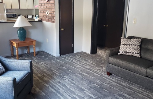 Our 2 bedroom unit offers a queen bedroom with an attached half bath, full bath and 2 twin bedroom, living room with a pull out sofa featuring a memory foam mattress, full kitchen/dining area and balcony. Our units can comfortably accommodate up to 6 guests and we are pet friendly!