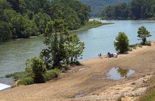 Huge windows and doors from the living area that open up to the deck outside where you can enjoy our beautiful Current River only a few feet away! Gravel bar right in front of the house and boat access only a short distance.