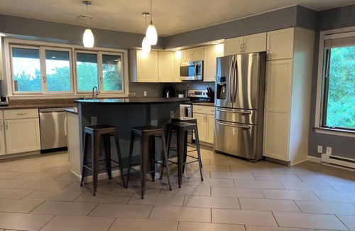 The extra-large chef's kitchen is fully equipped with everything you need - filtered water, ice, coffee maker, air fryer, double oven, instant pot, toaster, etc. Eat at the oversized island, at the dining room table, or outside on the deck with beautiful views of the golf course and Mount Nittany.
