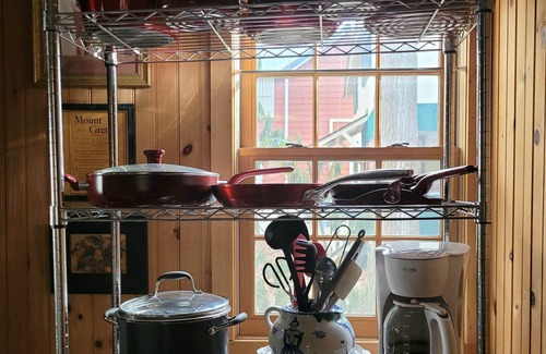 KITCHEN – Galley kitchen extremely well-stocked with stove/oven, refrigerator, microwave, Keurig & Mr. Coffee 12 cup coffee machines, dish sets, silverware, pots and pans, mixing bowls, pitchers, cups, wine glasses, mugs, toaster, toaster oven, waffle iron, blender, crock pot, knife set, food chopper, pantry items – everything needed to prepare meals at the cottage.