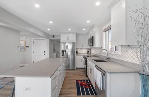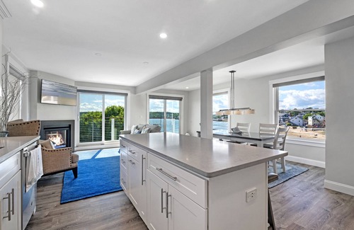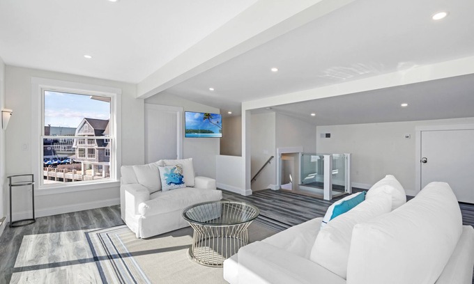 This beautiful totally redesigned newly renovated building offers the Pavillion Beach Suite and the Birds Eye View Suite. The Birds Eye View Suite is located on the second and third floors and provides 2100 square feet +/- of luxury living. This suite offers a split-level floor plan filled with natural light from sunrise to sunsets allowing you to enjoy the amazing water views and boating activity. The main floor of the Birds Eye View Suite provides you with a Juliet balcony coming off your kitchen and living room area. Up the stairs, you’ll have access to the loft area. Here you’ll find a wet bar, seating area, 1/2 bath and a large deck with spectacular views of the ocean, Stacy Boulevard, the Beauport Hotel and beyond. This unit offers 2 large bedrooms, 1 full bathroom with a soaking tub, 2 half bathrooms, a full kitchen, a wet bar in the loft area, and water views from almost every window in the unit. Each bedroom has a tv, comfortable beds, down comforters, blackout blinds and a closet. The Birds Eye View Suite offers 2 large bedrooms, 1 full bathroom with a soaking tub, 2 half bathrooms, a full kitchen, a wet bar in the loft area, and water views from almost every window in the unit. There is also a TV in loft for a total of 4 HD TV.