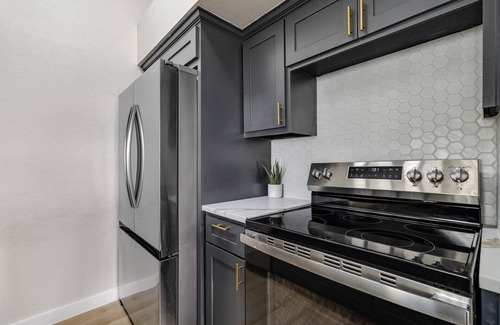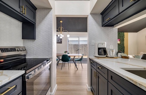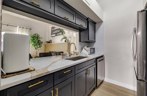 The kitchen is a true centerpiece, designed not only to be beautiful but practical for guests who love to cook. Brand-new appliances gleam against modern cabinetry and quartz countertops, while a fully stocked setup ensures you have everything you need to whip up a gourmet meal or a quick snack.