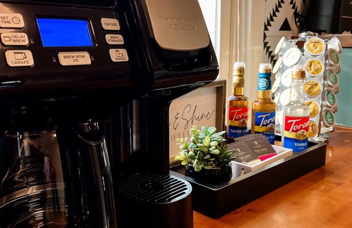 Step into the bright and cheerful kitchen, a culinary delight stocked with essentials. The coffee bar adds a touch of warmth to your mornings, creating a delightful oasis for food enthusiasts. An assortment of hot teas are available for your convenience, as well.