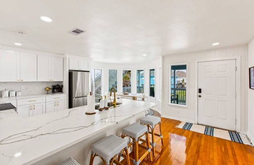 Once inside, make yourself right at home with cool coastal tones and upgraded modern amenities throughout. Brand new deluxe gourmet kitchen, custom cabinetry, refrigerator, stove, dishwasher, microwave, Keurig, & washer and dryer all available on the property. Plenty of supplies and utensils to easily whip up your favorite dishes. Meals can be enjoyed at either the sunny, large dining table or on the furnished deck for al fresco dining and water views.