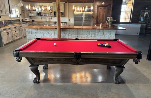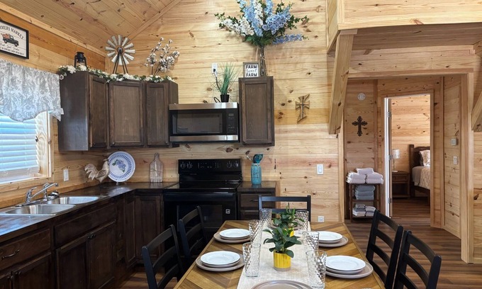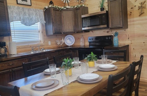 This Granbury cabin boasts 3 delightful bedrooms with 4 queen beds and a full kitchen. A tranquil and serene space awaits you, includes a bathroom with a shower and hair dryer. Guests can enjoy amenities like WiFi, AC, and heating during their stay. You are welcome to use the dock, fire pit, pool table, foosball table at the venue. Come and experience a phenomenal getaway surrounded by nature. We look forward to hosting you at River View Ranch & Resort.