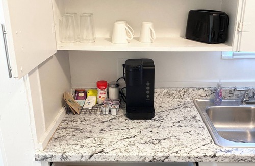 Is fully stocked with dishes, glasses, cups, utensils, pans, and spices needed to create a wonderful meal. The kitchen features appliances including an oven, refrigerator, microwave and toaster and a Keurig coffee maker.