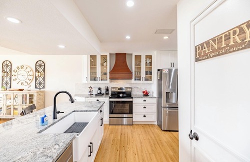 The Blue Pearl PCB sleeps up to 7 guests (6 all ages + 1 toddler). Inside is a gorgeous living area with oversized sectional sleeper sofa and two additional chairs. The three flatscreen smart TV's are large and perfect for taking in movies at night or sports on the weekend. The open concept kitchen offers all full-sized appliances, a beautiful farmhouse sink, and island that is perfect for prepping meals while socializing with friends and family. Dishes, pots, pans, silverware, blender, a Keurig Duo coffee maker, and more are available to make meal and snack prep a breeze. Seating for 4 is offered with our dining table with 2 bar stools situated at the kitchen peninsula counter. Pack n Play and/or a Graco Made-2-Grow Highchair/booster for infants-40 lb child are available upon request "before" check-in.
